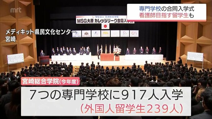 夢への第一歩を踏み出します。宮崎市で専門学校の合同入学式が行われました。宮崎総合学院が運営する7つの専門学校には、今年度917人が入学し、このうち4分の1以上が外国人留学生です。9日、行われた入学式では、…