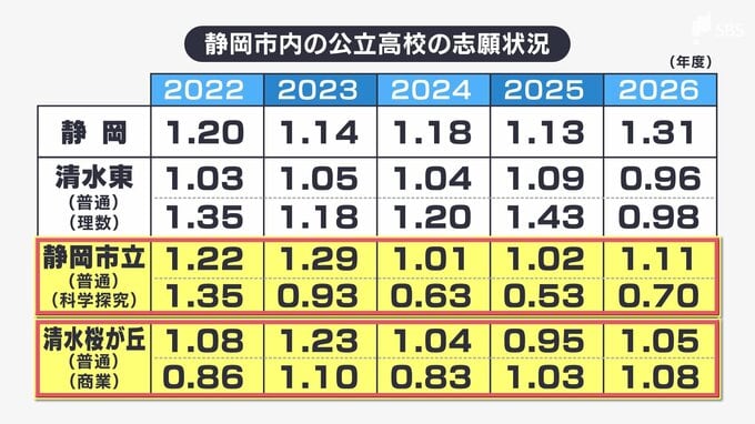 2026年度は、進学校の清水東が定員割れとなりました。今回、統合される予定の静岡市立と清水桜が丘はいずれも1倍を上回りましたが、2025年度は定員割れの学科もありました。