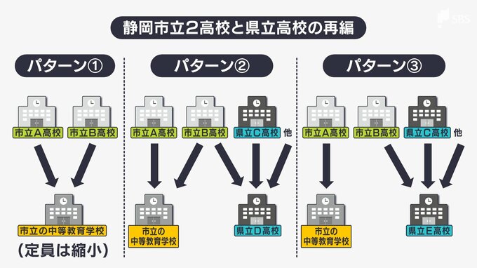 静岡市は9日、3つのパターンを出し、A高校とB高校が静岡市立と清水桜が丘を示しています。