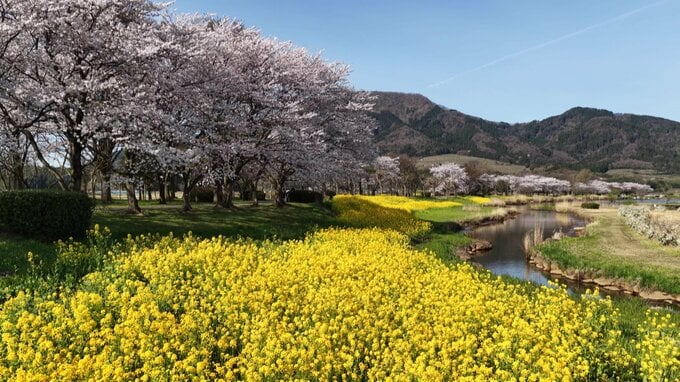 新潟市西蒲区の角田山の麓に広がる上堰潟公園では、およそ450本の桜と、160万本の菜の花が同時に見頃を迎えています。