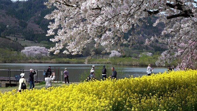見上げれば淡いピンクの桜が空を覆い、足元を見れば鮮やかな菜の花がじゅうたんのように敷き詰められる、この“春の二重奏”を写真に収めようと、家族連れなどで賑わっていました。
