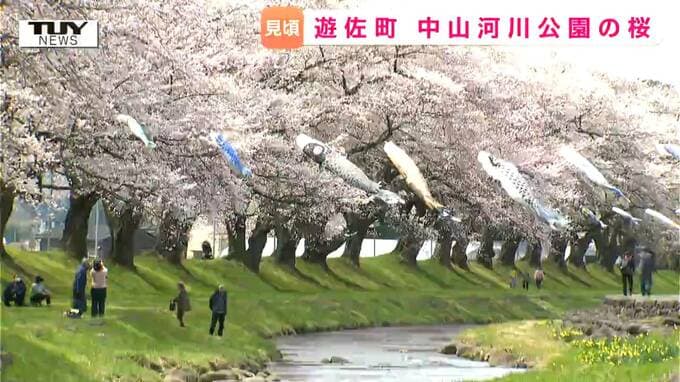 桜の美しい画像をご覧いただきます。こいのぼりと鳥海山とのコラボレーションで知られるスポットです。悠々と空を泳ぐこいのぼりと見ごろを迎えた桜。山形県遊佐町の桜の名所中山河川公園です。 鳥海山のふもと…