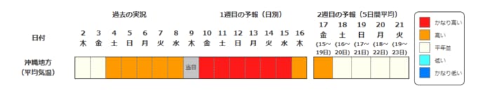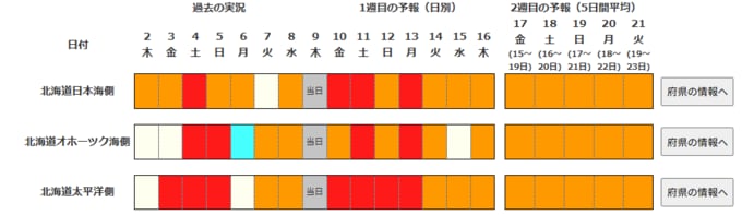4月15日頃から「この時期としては10年に一度程度しか起きないような著しい高温」になる可能性 気象庁が「高温に関する早期天候情報」発表【東海、近畿、北陸、中国、四国、九州北部、九州南部・奄美】関東甲信なども気温高い日多く 南日本放送 2026年4月10日(金) 06:00 国内 北海道地方 日本海側、オホーツク海側、太平洋側いずれも、14日ごろから21日にかけて、平均気温が平年より高い日がほとんどです。 沖縄地方 沖縄地方では、15日ごろまでかなり高い日が続きますが、16日ごろからは、平年並みの日が多くなりそうです。