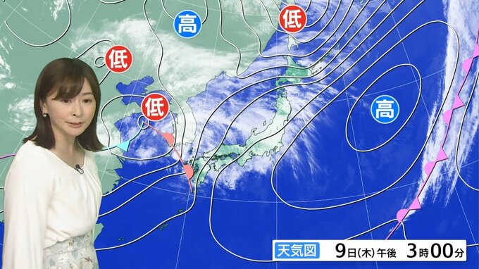 きょう夜は九州から東海で雨の範囲が広がり、雨が強まる所が出てきそうです。あすの午前中は、九州から東海で雷雨や非常に激しい雨の所があり、関東でも朝から雨が降ったりやんだりするでしょう。夜になると、九州から東北は雨がやむ所が多くなる見込みです。北海道では土曜日の未明ごろまで雨が降り、その後は雨雲が離れても、北日本などでは強風が続く予想のため、ご注意ください。