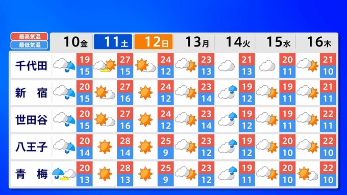 11日(土)の予想最高気温は、28度や29度というところ多いですので、半袖を準備しておきましょう。