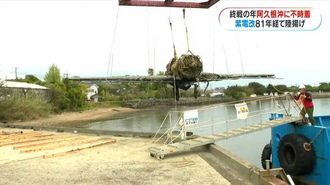 (記者)「出水市の漁港です。紫電改が台船からゆっくりと陸へ移動します」