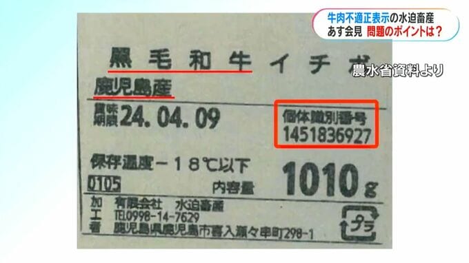 これは今回、不適正と指摘された牛肉のラベルです。赤い太枠で示した10けたの数字。これが個体識別番号です。