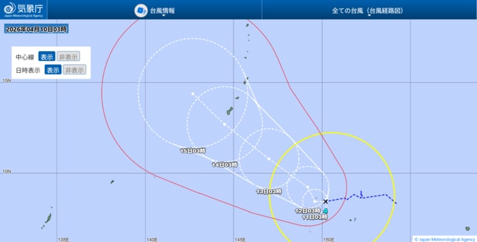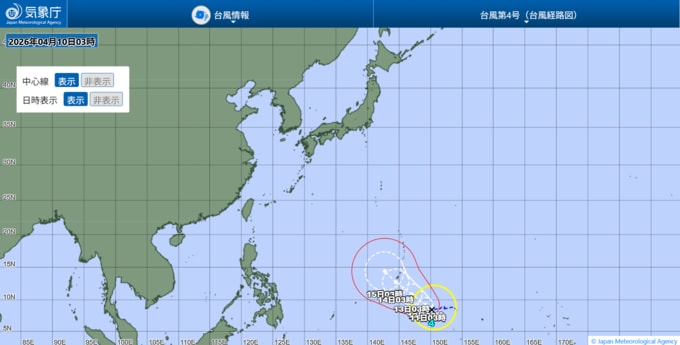 台風4号は、10日午前3時にはトラック諸島近海にあって、1時間に20キロの速さで西へ進んでいます。
