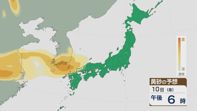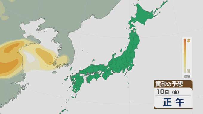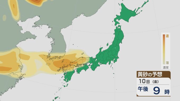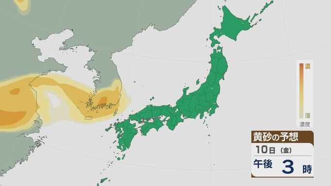 【黄砂情報】大陸からの黄砂 11日(土)は関東にも 12日(日)にかけては北陸や東北でも飛んでくる見込み 飛来予想シミュレーション 北陸放送 2026年4月10日(金) 10:19 国内 大陸からの黄砂は、10日(金)の夜は九州などで飛び、11日(土)には関東にかけて広い範囲で飛来しそうです。 黄砂の予想ですが、10日の夜のはじめごろから九州北部や中国地方など西日本に飛来する見込みです。