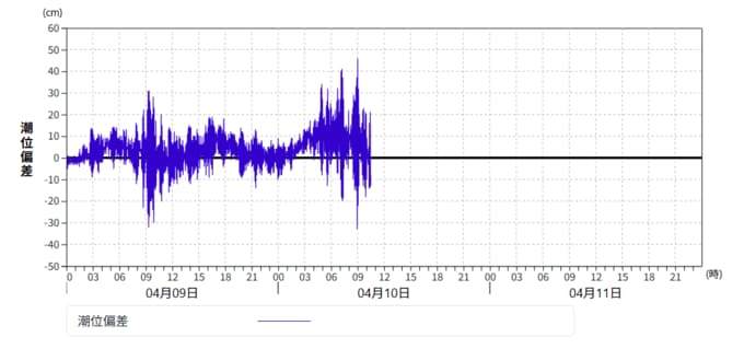 奄美地方の沿岸では、4月10日朝から顕著な海面昇降が発生しています。