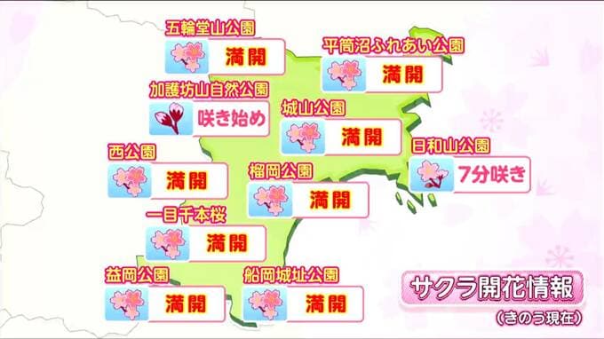 9日の暖かさで一気に開花が進み、宮城県内は満開を迎えているところが増えています。9日現在の各地の開花状況は以下の通りです。