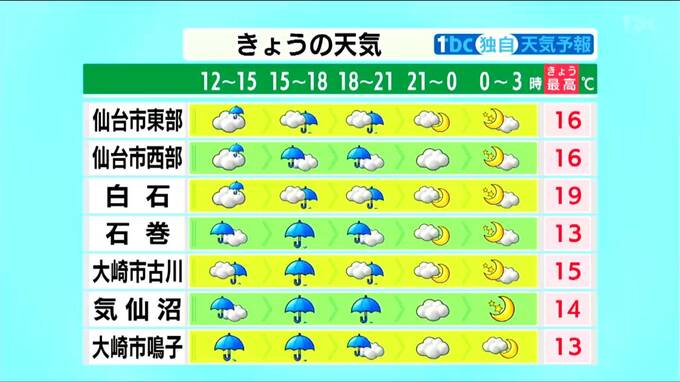 最高気温は地域によって差があり、石巻は今からほとんど気温が上がらず13℃止まりとなる一方、南部の白石では午後に暖かな空気が流れ込み、19℃まで上昇する見込みです。4月下旬並みの気温まで上がるとみられます。