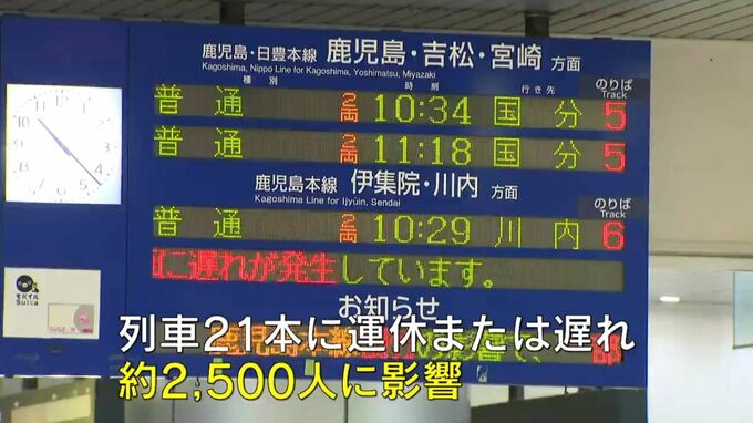 JR鹿児島本線では列車が倒れた竹に接触し、およそ3時間運転を見合わせました。JR九州によりますと、10日午前7時半ごろ、鹿児島本線の薩摩松元駅から伊集院駅に向かっていた上り普通電車が、倒れた竹に接触しました…