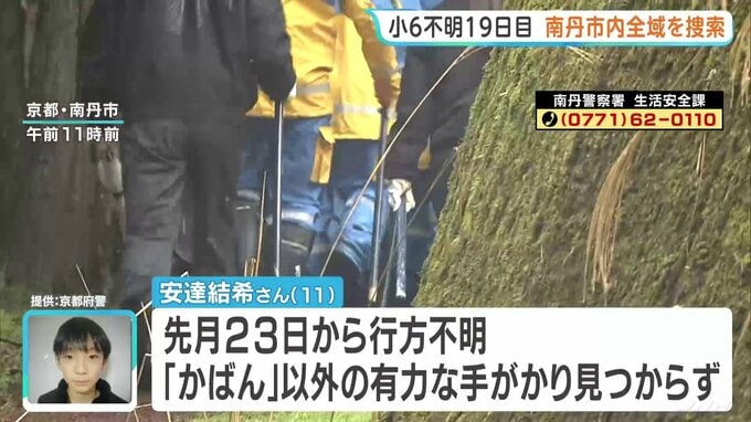 行方不明になってから19日目。きょうも捜索が続いています。京都府の南丹市立園部小学校6年の安達結希さん(11)は、先月23日に父親の車で学校のそばまで送り届けられたのを最後に行方不明になっています。「通学…
