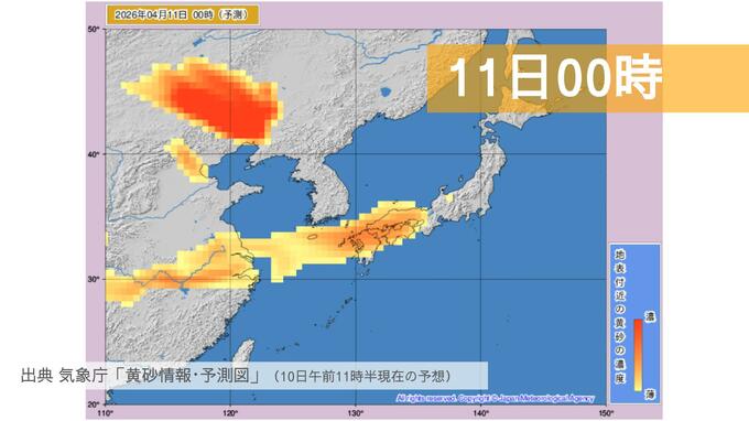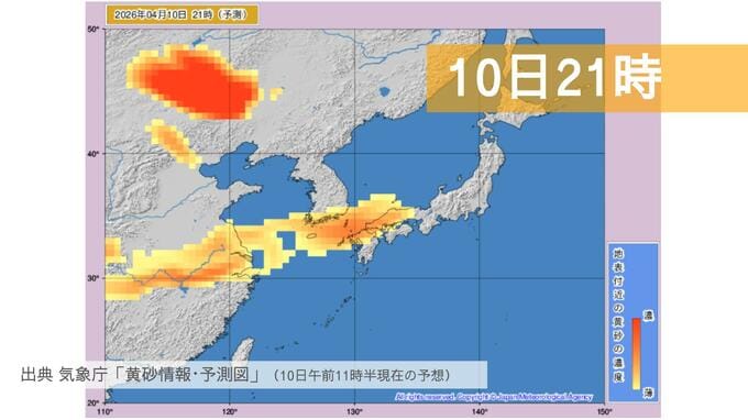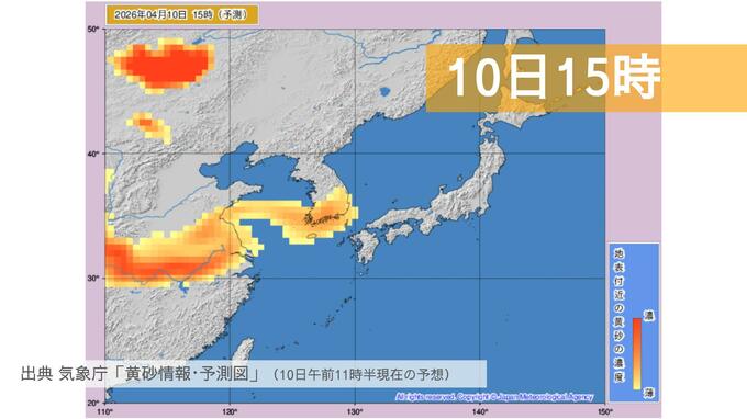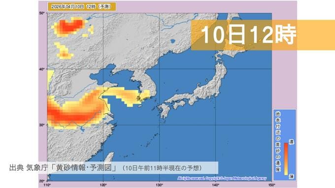 西日本で「黄砂」飛来 下関で視程6.4km 11日にかけて東日本や北日本でも警戒 長崎放送 2026年4月10日(金) 11:57 国内 ■明日11日にかけての予報 気象庁の黄砂予測によりますと、黄砂の濃いエリアは今後、北西の風に乗って東へ移動する見込みです。 今後:午後から夜にかけて、近畿や東海、関東など東日本でも視程が10km未満となる地点が増える見通しです。