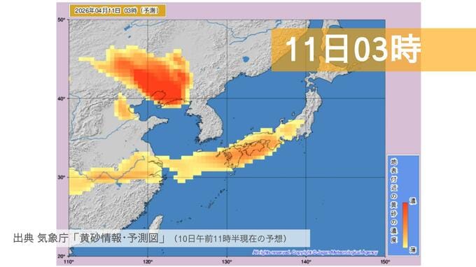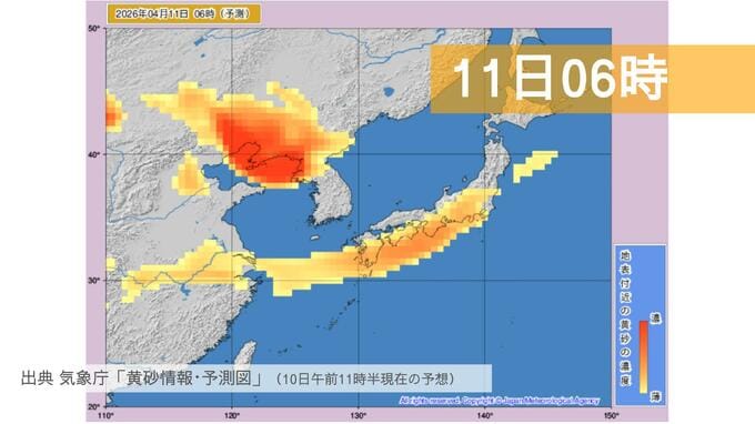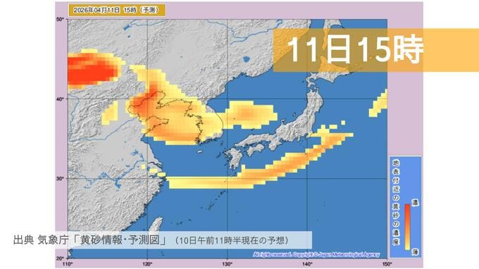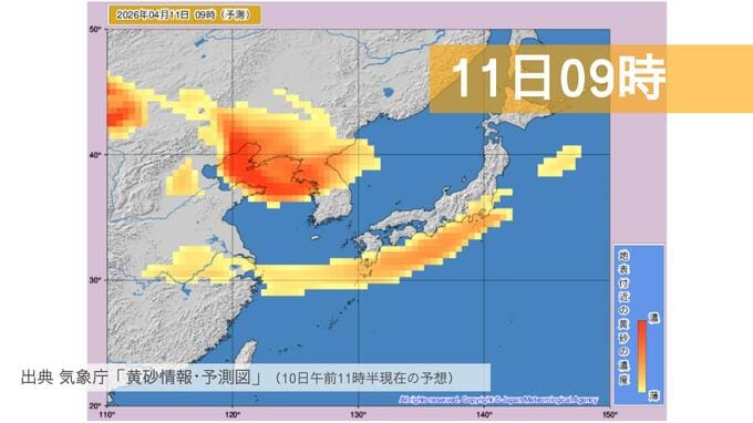 11日の影響:明日土曜日も北日本を含む広範囲で黄砂が滞留する予測で、視界が5km未満まで悪化する場所があるかもしれません。