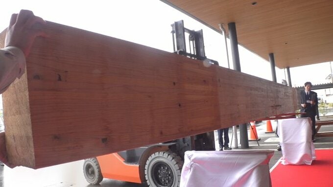 この木材は大屋根リングのはりに使われていた杉材で、縦42cm、横21cm、長さはおよそ5mあり、建設中の富士川中学校の新校舎に再利用されます。
