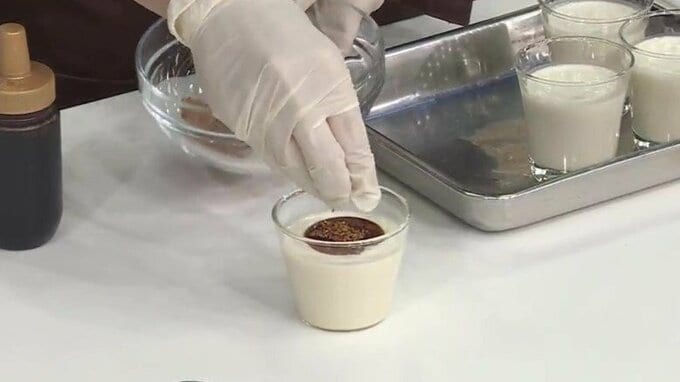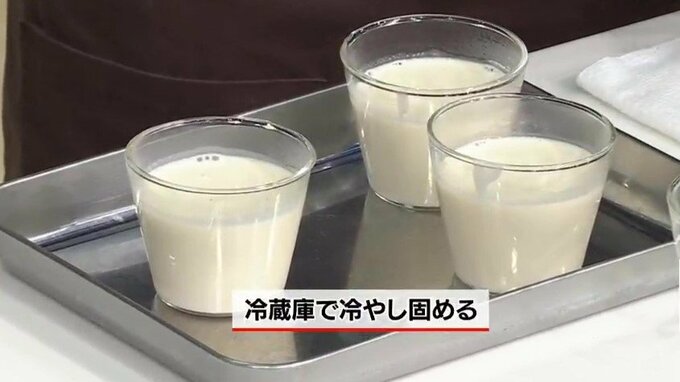 5.出来上がったプリン液をカップに入れて、冷蔵庫で冷やし固める。
