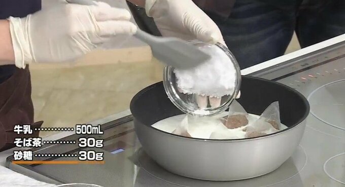 3.鍋にそば茶・牛乳・砂糖を入れて火にかけ、ふつふつしてきたら弱火にして混ぜながら5分ほど煮出す。