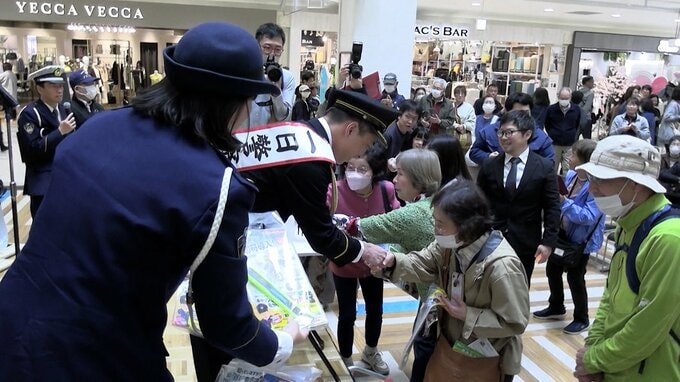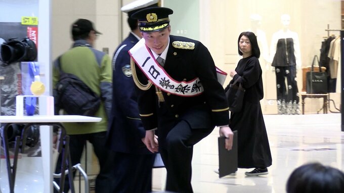 岡山県倉敷市のショッピングモールで、自転車のヘルメット着用など交通安全を呼びかけました。警察官の制服に身を包んだ金メダリストの登場です。