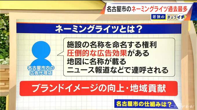 ネーミングライツに詳しい、名古屋市内の広告代理店によると「施設の名称を命名する権利。圧倒的な広告効果がある。地図に名称が載るうえ、ニュース報道などで連呼される」ということです。