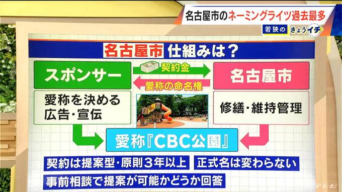 担当者によると、スポンサーは“契約金”を払い、名古屋市は“愛称の命名権”を与えます。例えば、名古屋市内の公園にCBCがスポンサーになり「CBC公園」と名付けた場合、名古屋市は受け取った契約金を、公園の修繕・維持管理に使用します。