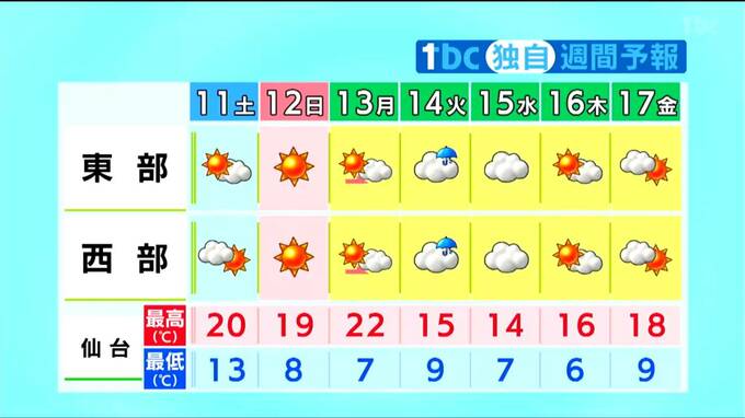 最低気温は、12℃前後の所が多く、10日朝と同じかやや高いでしょう。最高気温は18℃から20℃と、4月下旬から5月中旬並みの見込みです。