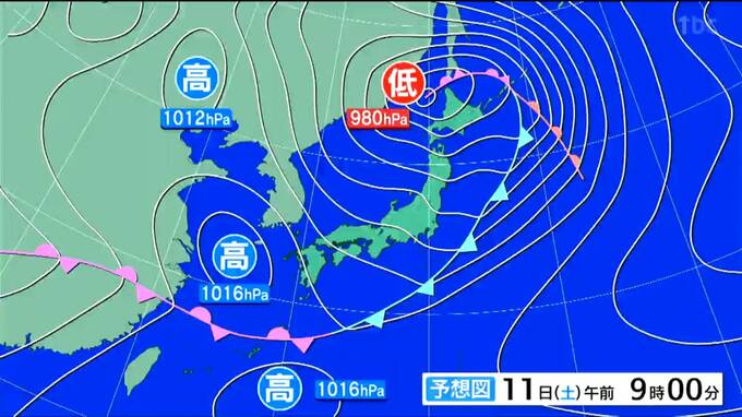 前線を伴った低気圧は発達を続け、北海道付近に中心を移すでしょう。北海道と東北地方は、等圧線の間隔が狭くなりそうです。
