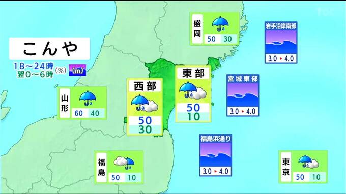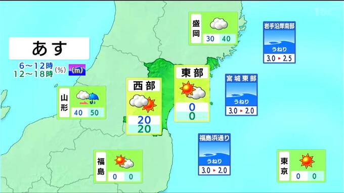 午後9時頃まで雨の降る所がありますが、その後は曇りで、晴れ間が出るでしょう。海上では、南寄りの風が強く吹き、波が4メートルまで高くなるため、強風・高波に注意が必要です。
