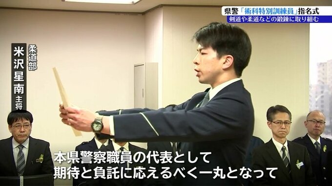 小野本部長は「代表として誇りと自覚を持ち、努力と練磨によって技能向上に努めるよう期待している」と激励し、柔道部の米沢星南主将が力強く決意を述べました。