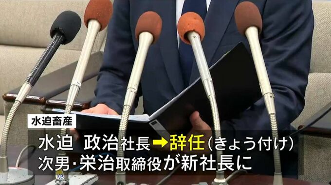 水迫政治社長はきょう4月10日付けで辞任し、水迫社長の次男で新社長に就任した水迫栄治取締役と、長男で牛肉の加工などを担う水迫政輝部長が出席しました。