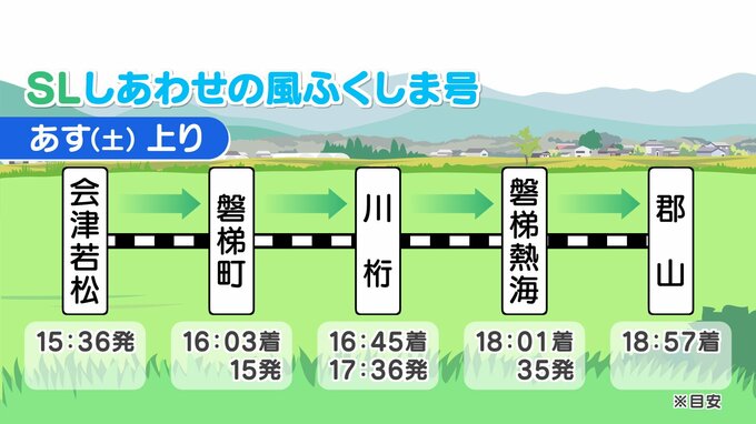 SLの運行時間は、あくまで目安ですが、11日(土)は会津若松を午後3時36分に出発したあと、途中で磐梯町、川桁、磐梯熱海に停車し、午後6時57分に郡山に到着します。
