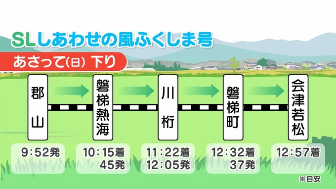 12日(日)は郡山を午前9時52分に出発、往路と同じ駅に停車しながら会津若松を目指し、午後0時57分の到着予定です。途中停車する駅では、地元のキャラクターによる出迎えや、太鼓の演奏なども行われるということです。