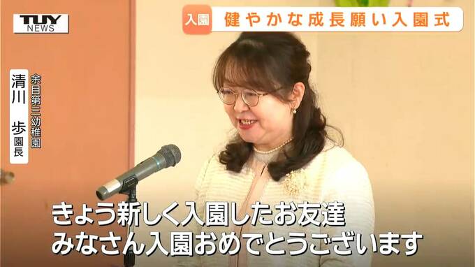 余目第三幼稚園 清川歩 園長「今日新しく入園したお友達、みなさん入園おめでとうございます。これから鬼ごっこをしたり、サッカーをしたりお絵描きや砂遊びどろんこ遊び、好きな遊びを沢山見つけて一緒に遊びましょう」