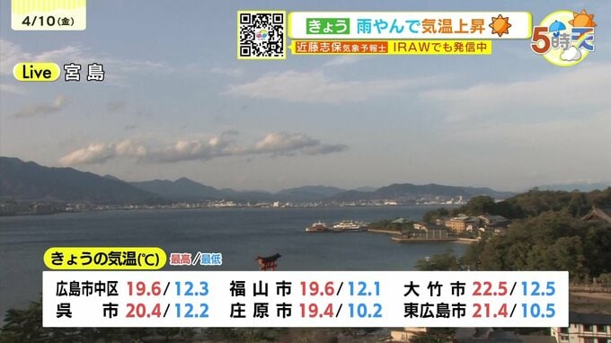 きょう10日(金)の広島県内は、午前中まで雨が降ったところが多いですが、だんだんと晴れてきました。きのうからの雨量はことし最多のところが多く、南西部では24時間雨量50mmを超えたところが多くなりました。廿日市市津田で87.0mmでした。夕方以降日が差して、大竹市では午後4時半頃に22.5℃まで上がりました。