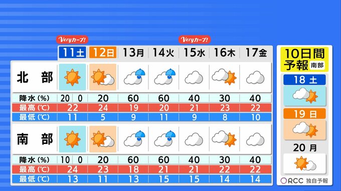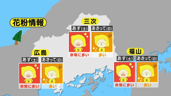【4/11・12(土日)広島天気】晴れて行楽日和 汗ばむ陽気に 中国放送 2026年4月10日(金) 19:10 国内 天気 この先の10日間 月曜・火曜は雨 周期変化 13日(月)14日(火)は雨が降る見込みです。春らしい天気が予想され、周期的に変わるでしょう。花粉は、ヒノキが最盛期ですが、来週にかけてゆっくりとピークは過ぎる予想です。