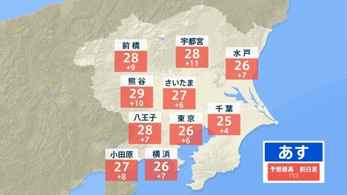 あす11日(土)は朝から気温が高く、西日本や東日本の最低気温は15℃前後と過ごしやすいでしょう。最高気温は25℃以上の夏日が続出する予想で、特に関東で気温が上がりそうです。宇都宮28℃、熊谷(埼玉)29℃と、真夏日まで一歩手前の暑さが予想されています。