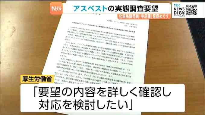 これを受け団体は、女性が当時扱っていた化粧品やベビーパウダーなどにアスベストが含まれるか調査し、結果を公表することや、化粧販売員、消費者への注意喚起、健康管理態勢の整備などを求めています。