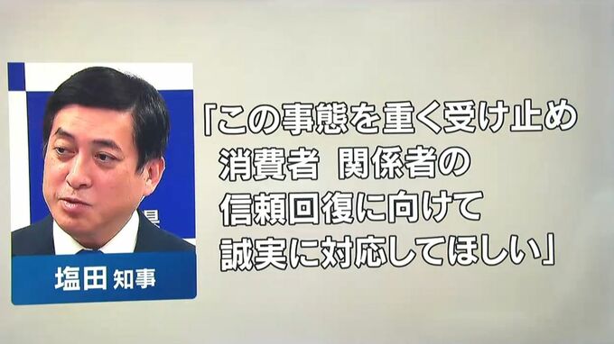 県は国とも連携して合同で調査を行うことにしていて、塩田知事は10日、「この事態を重く受け止め、消費者、関係者の信頼回復に向けて誠実に対応してほしい」とのコメントを出しました。