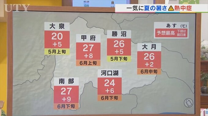 大月は6月中旬並み、甲府も6月上旬並みの気温と各地で今年一番の暑さとなりますので熱中症に注意が必要な状況です。