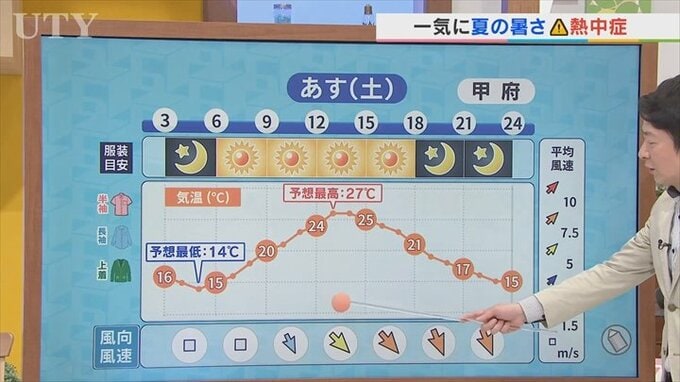 しかも北風で風速8m~9mほどと予想しているんですが、これは洗濯物を干していると、簡単に飛ばされるような強い風となりますので、あすは体感的には中北ではそこまでの暖かさを感じないかもしれませんが風を通しにくい服装がおすすめとなります。