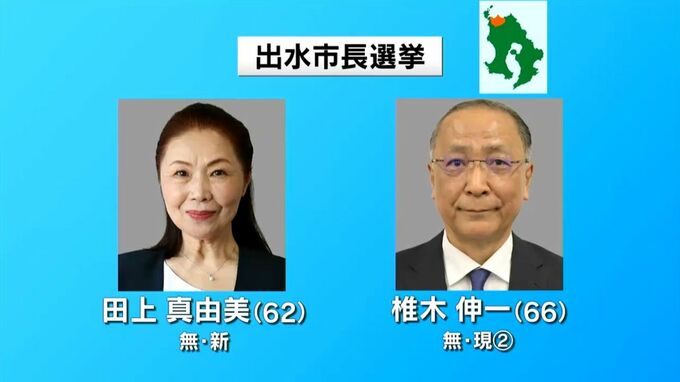 任期満了に伴う出水市長選挙は12日の投票に向け一騎打ちの戦いとなっています。立候補したのは、届け出順に、新人で元出水市議会議長の田上真由美さん(62)、現職で3期目を目指す椎木伸一さん(66)の2人で、いず…