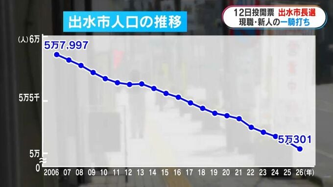合併時の人口はおよそ5万8000人でしたが、この20年で年々減少し、現在は5万人あまり。選挙の争点の1つが人口減少対策です。