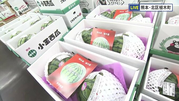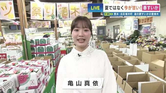 亀山真衣アナウンサー「スイカ、スイカ、スイカが並んでいますよ!ということで、私が来ているのは『道の駅 すいかの里 植木』です。今が旬の『春スイカ』を買い求めに、県内、それから県外からも、山口、長崎からお客さんいらっしゃっていました。そしてゴールデンウィーク頃になると、オープン前100人ほど並ばれるそうですよ!」