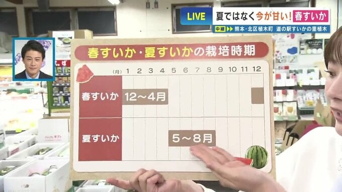 「それだけ大人気の春スイカ。すごいですよね!夏のスイカと何が違うのかと言いますと、夏のスイカは常に温かい時期に育つので、一気にポンと大きくなるんですね。一方で、春のスイカは一日の寒暖差が大きい時期に育つので、ゆっくりゆっくり大きくなっていって、甘さが皮目まで伝わっていく。だから甘いんだそうです!」