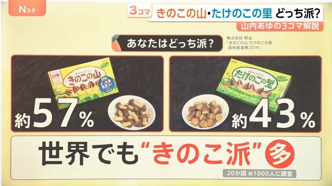 2019年に行われた「きのこの山・たけのこの里 国民総選挙2019」では「きのこの山」が57%で「たけのこの里」が43%と、当時は「きのこの山」が多数派でした。