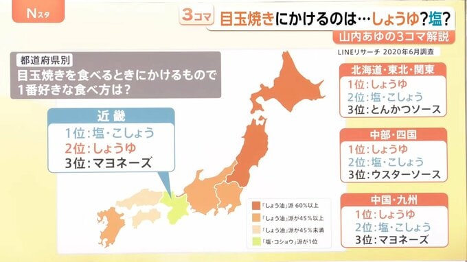 特に北海道や東北地方では「しょうゆ派」が多数派だった一方、近畿地方だけは「塩・こしょう」の方が多数派でした。「第3の選択肢」も地域によって差がありました。