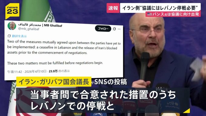 パキスタンで行われる予定のアメリカとの協議を前に、つい先ほど、イラン側はレバノンでの停戦などが協議開始のために必要だと主張しました。イランのガリバフ国会議長は、「当事者間で合意された措置のうち、レバ…