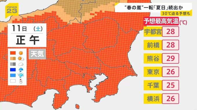 関東地方では気温が一気に上昇。最高気温は、東京で26度と今年初めての「夏日」となる見込みのほか、埼玉の熊谷では29度と、7月上旬並みの暑さが予想されています。