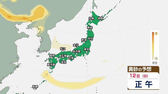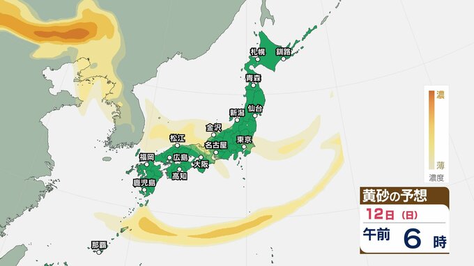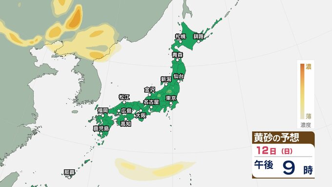 【黄砂情報】きょう11日(土)からしばらくの間「日本列島」に飛来か…九州・中四国・近畿・東海・関東・東北など 広い範囲で影響の可能性 11日(土)~14日(火)黄砂シミュレーション【気象庁 11日現在】 RSK山陽放送 2026年4月11日(土) 11:30 国内 天気 12日(日) 11日(土)~14日(火)黄砂シミュレーション 11日(土)~14日(火)黄砂シミュレーション